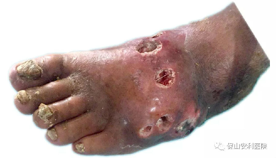 經(jīng)??漆t(yī)生檢查:左足背見(jiàn)腫塊,局部皮膚潮紅,有6個(gè)破潰口,流出豆腐渣樣物, 診斷為痛風(fēng)性關(guān)節(jié)炎急性發(fā)作并破潰感染,若不及時(shí)治療,傷口感染將會(huì)導(dǎo)致截肢。醫(yī)生首先應(yīng)用抗感染,止痛,降尿酸和傳統(tǒng)的換藥方法對(duì)創(chuàng)面清創(chuàng)、消毒、引流治療,入院第9天感染得到控制,但創(chuàng)面沒(méi)有愈合的跡象,應(yīng)用創(chuàng)面負(fù)壓聯(lián)合自體富血小板凝膠治療,創(chuàng)面愈合,恢復(fù)順利,治愈出院。