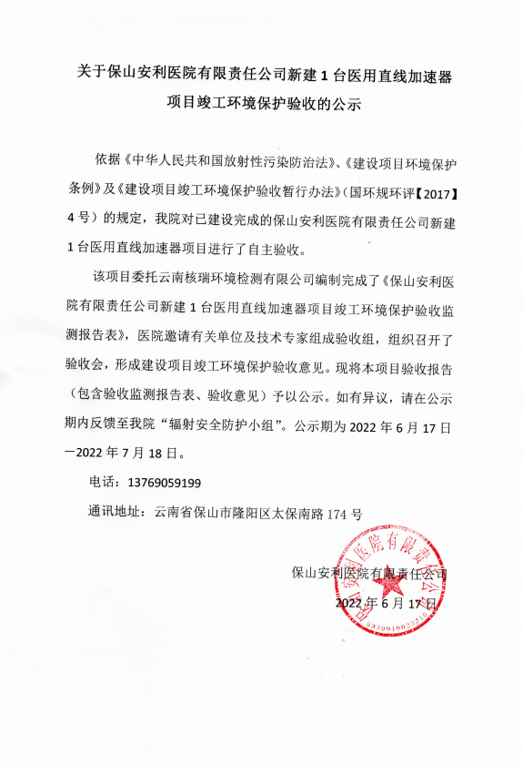 我院對使用II類射線裝置核技術(shù)利用項(xiàng)目進(jìn)行了現(xiàn)場檢查和驗(yàn)收。委托云南核瑞環(huán)境檢測有限公司編制完成了《保山安利醫(yī)院有限責(zé)任公司新建1臺(tái)醫(yī)用直線加速器項(xiàng)目竣工環(huán)境保護(hù)驗(yàn)收監(jiān)測報(bào)告表》,醫(yī)院邀請有關(guān)單位及技術(shù)專家組成驗(yàn)收組,組織召開了驗(yàn)收會(huì),形成建設(shè)項(xiàng)目竣工環(huán)境保護(hù)驗(yàn)收意見?,F(xiàn)將本項(xiàng)目驗(yàn)收報(bào)告(包含驗(yàn)收監(jiān)測報(bào)告表、驗(yàn)收意見)予以公示。如有異議,請?jiān)诠酒趦?nèi)反饋至我院“輻射安全防護(hù)小組”。公示期為2022年6月17日-2022年7月18日,公示時(shí)間為20個(gè)工作日。